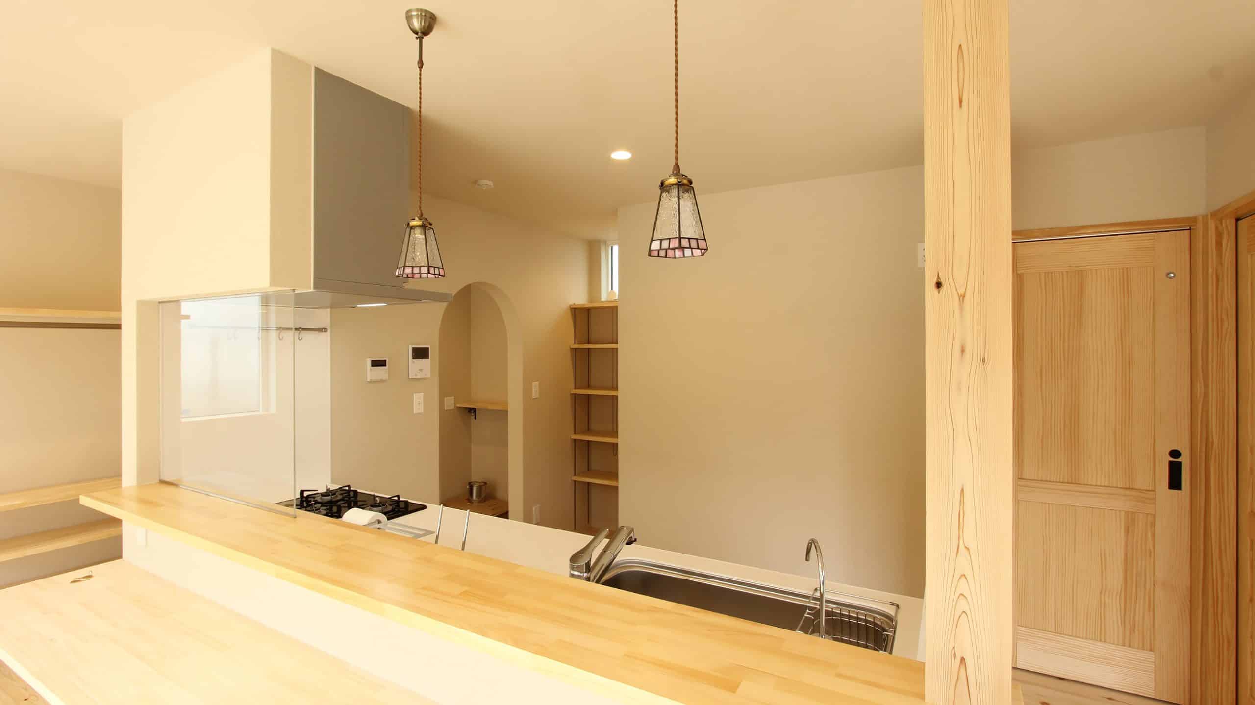 アーチの下がり壁やペンダント照明に2段カウンターやコンロ前ガラスなど