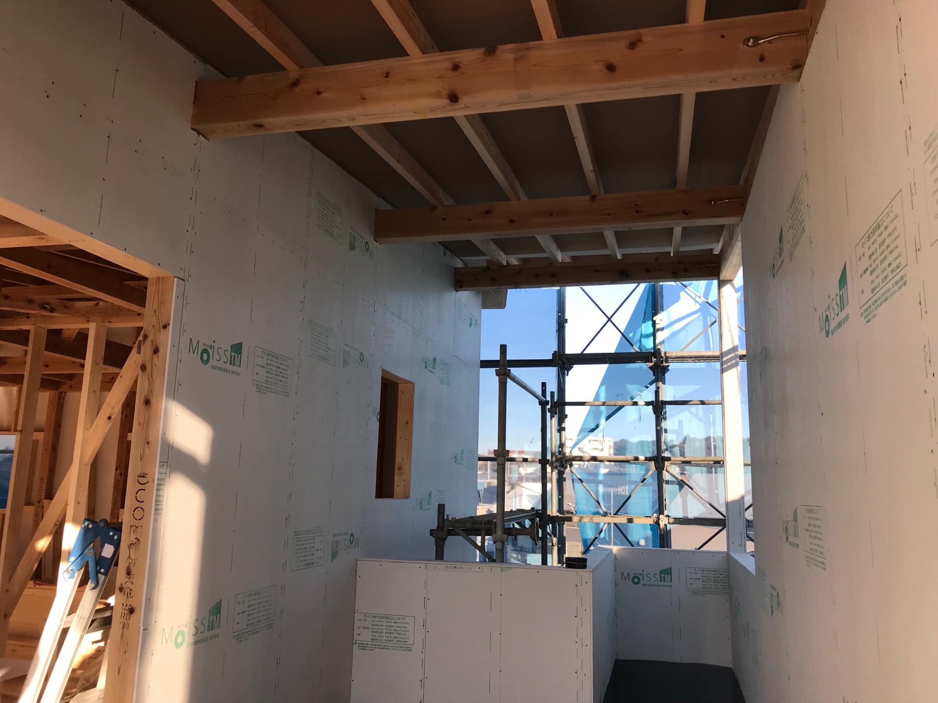 ecomoは構造体(柱、梁)の外にモイスパネルを施工し、その上に透湿防水紙、通気胴縁、外壁材(漆喰、サイディング材)となっています。