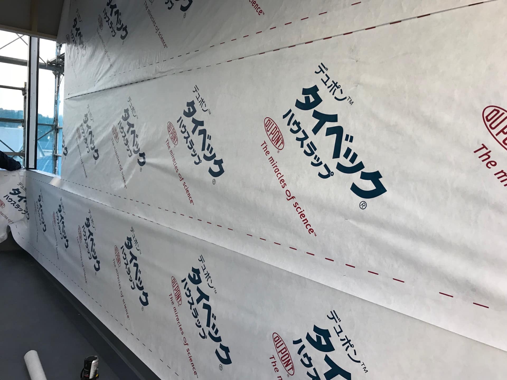 ecomoはこの上に施工する透湿防水紙をデュポン社のタイベックハウスラップを使用しています。