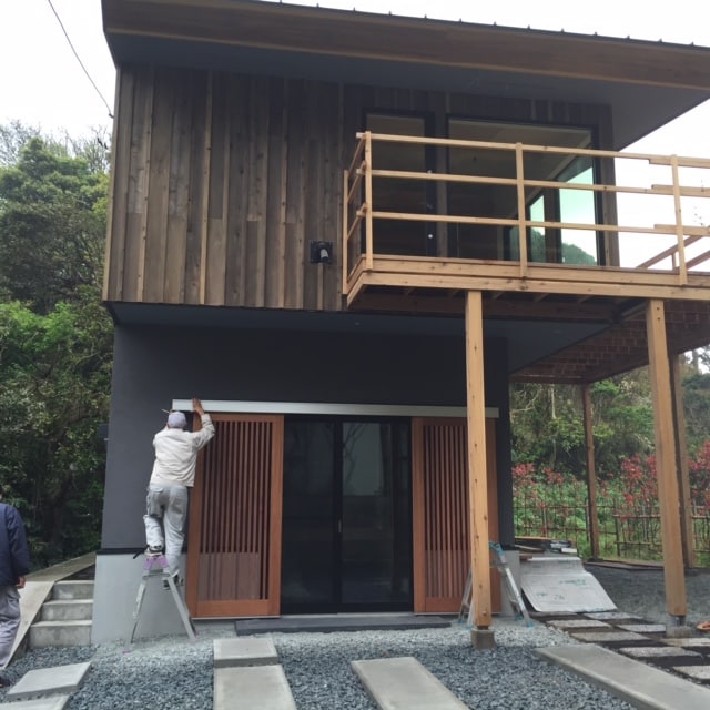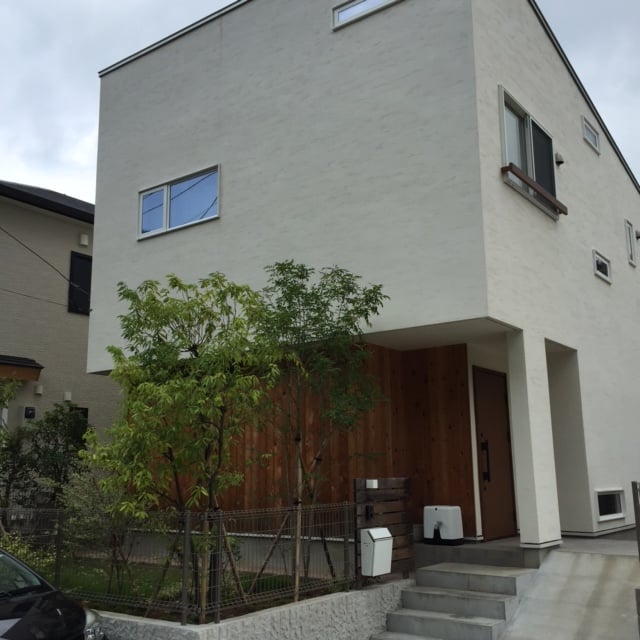 こちらのお宅も外壁の木張り部分と漆喰の真っ白な壁にグリーンが素敵に栄えてます!