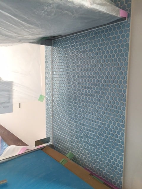 洗面化粧台は造作なので、こちらもタイルを一部施工してます。