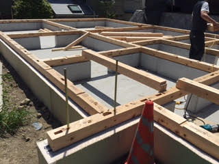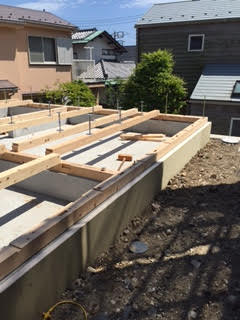 基礎のコンクリートの上に、木の土台を乗せている様子です! 2日後には、いよいよ上棟です。。!