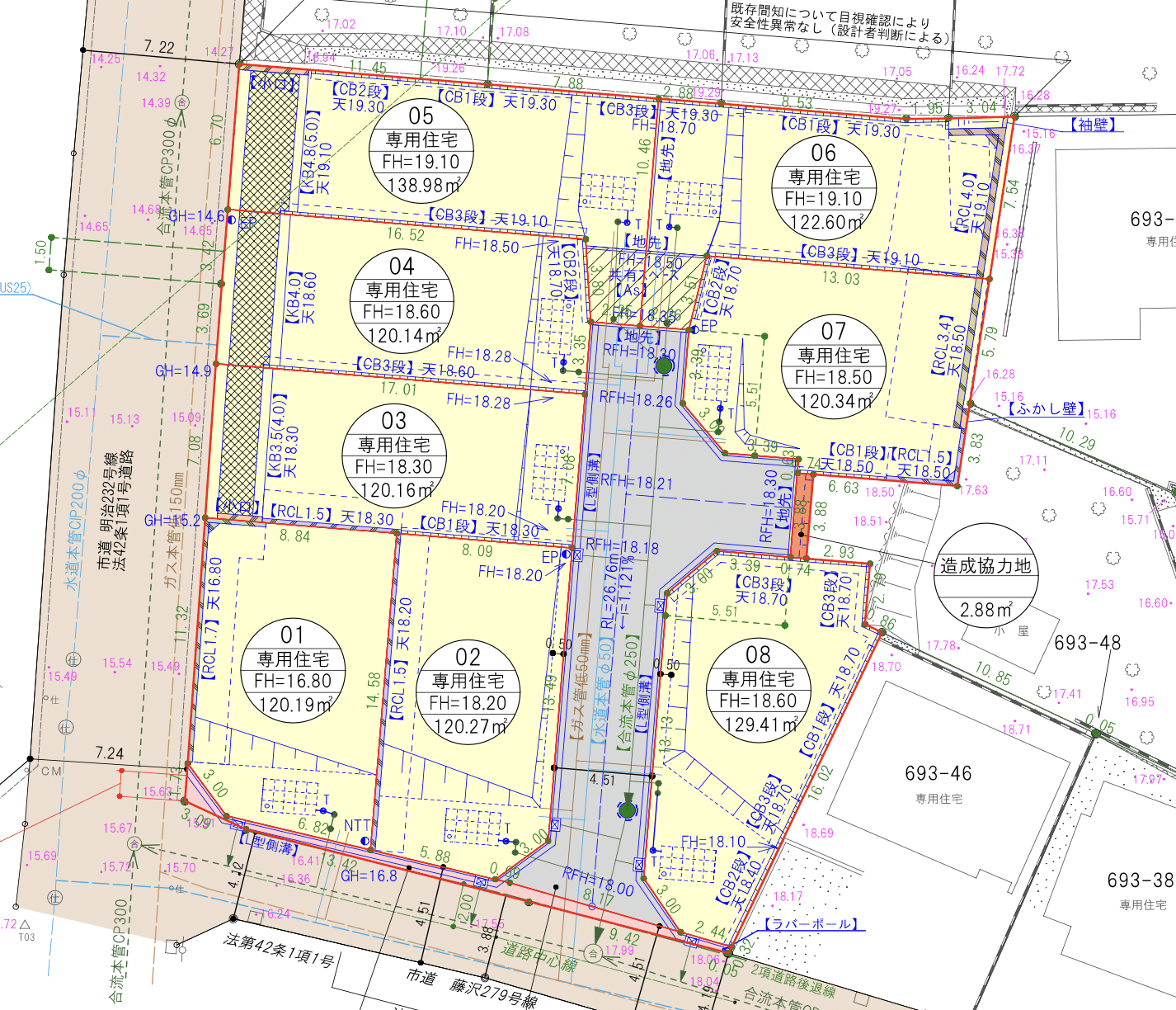 土地の形、道路の形状、高低差、土留の位置などこの図面に記載があります。