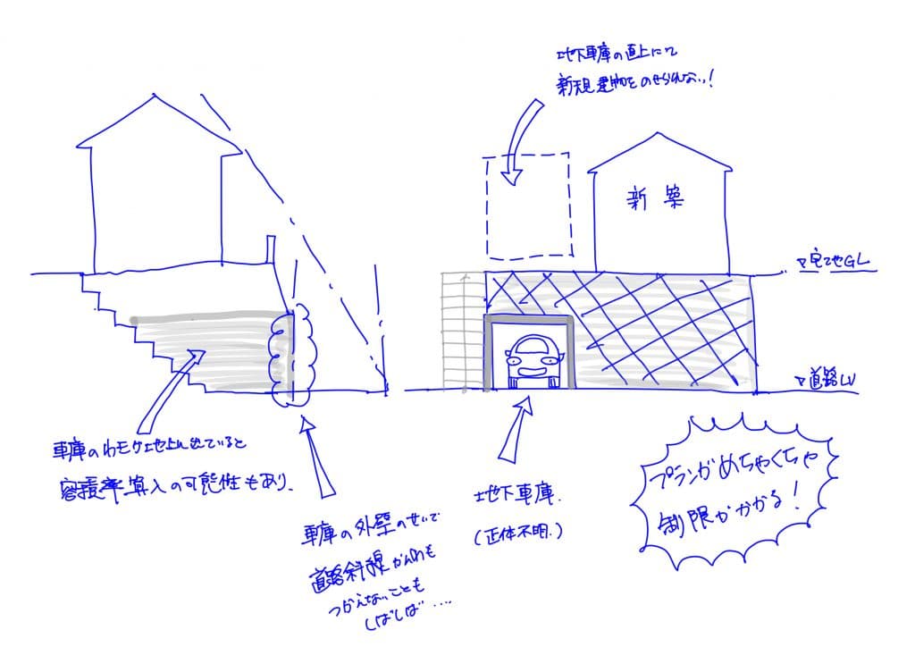 しかも全部埋まっていなく一部地下車庫の側面など出ていたりしたら、地下室の容積緩和も使えなくケースも有り建物容積にも影響がある事や、外壁後退による道路斜線の後退緩和が使えなくわで悪影響が出たりするので大きい敷地にでなく地下車庫が存在している部件はおすすめしてません。