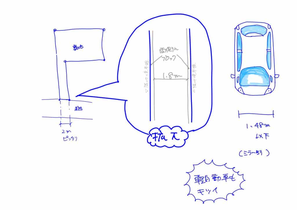 最低限の2Mだけ接道している物件をよく見かけます。公簿上2Mの接道なので現地に行くと境界ブロックが敷地内に有り有効寸法が1.8m等もありそうなると軽自動車も敷地内に置くことができません。