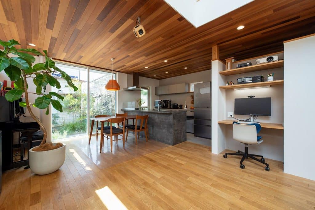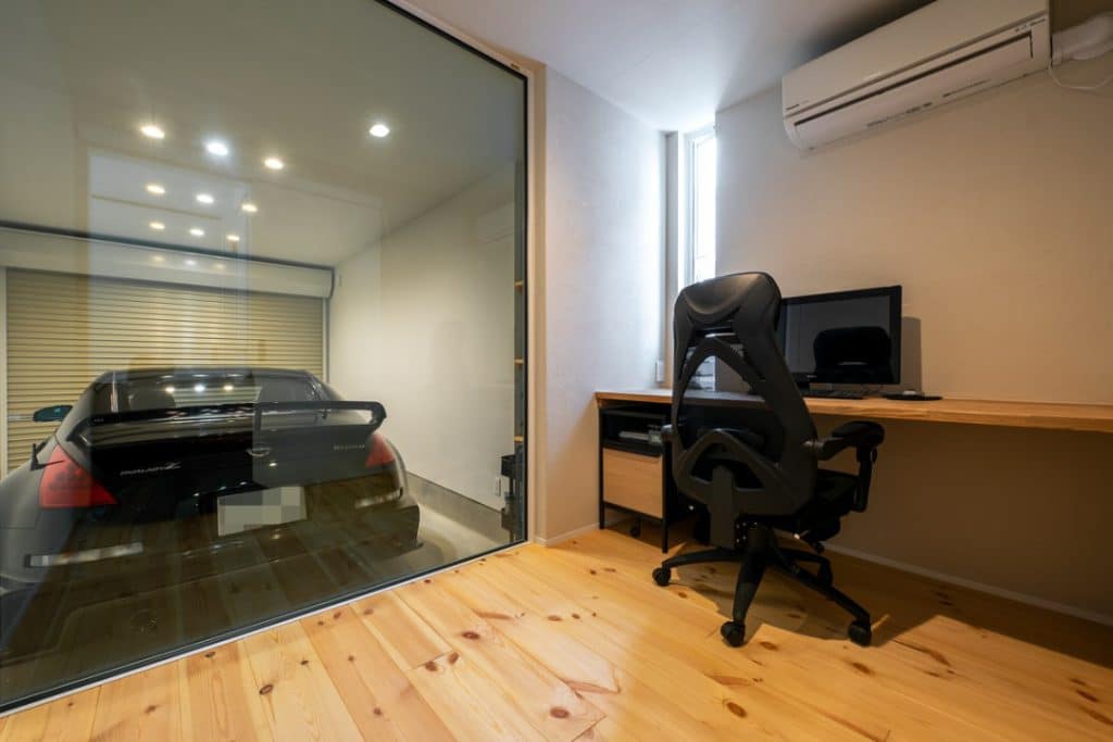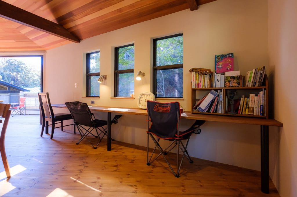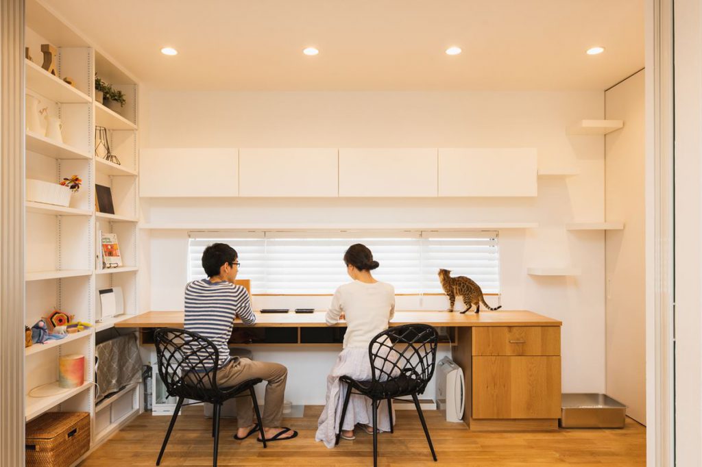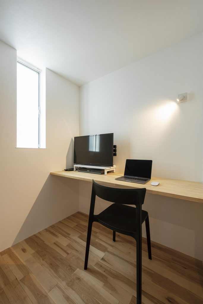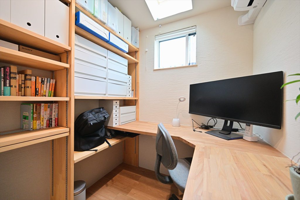 玄関から直接アクセスすることができて、LDKや居室とは動線を切り離した場所に設けた書斎。在宅勤務時のワークスペースとして活用されている