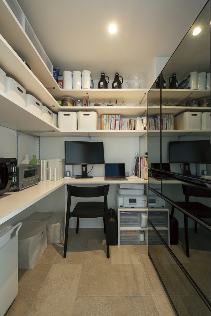 キッチンの右手にはパントリー兼ワークスペースがあり、冷蔵庫なども収納。レンジ類を置いているカウンターはパソコンデスクも兼ね、夫人のワークスペースになっている。