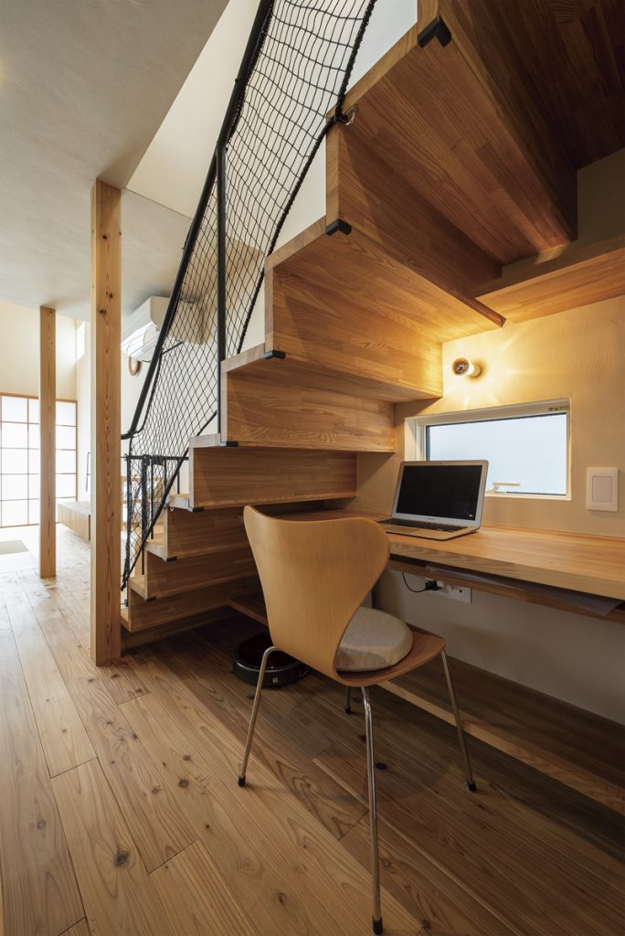 柱がなく、すっきりと美しい木製の片持ち階段。階段下はカウンターを造り付けワークスペースとして活用。ロボット掃除機の定位置にもなっている。