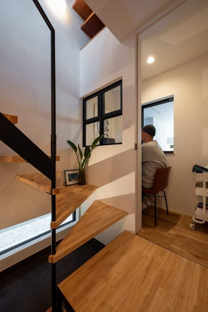 玄関から2階へ続く階段の途中に設けたリモートスペース。コンパクトな程よい広さで、外の景色も見ることができる。