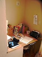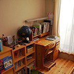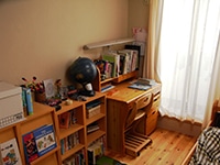 ご主人:私は造作。子供部屋の造作机なども気に入ってますね。 子供の年が離れているので、色々と悩みました。中学生と小学生なので、部屋を別々にしたいという希望がありましたけど、、広さにも限度がありますから。明確に二つにわけずに、壁の上部分を通す形にして、1台のエアコンで充分なスタイルになっています。