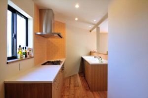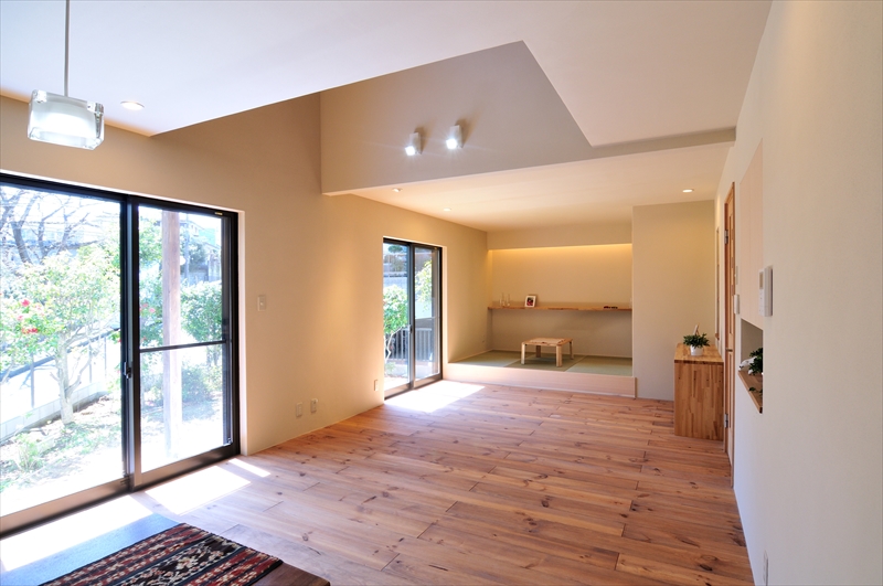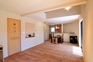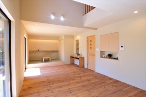 戸建て全面改修 吹き抜けのあるLDK 「建て替えかリフォームか?」検討に検討を重ねた結果の全面フルリフォーム工事となりました。間取りを大きく変え、吹き抜けのある開放感たっぷりのLDKになりました。珪藻土で仕上げた室内は「非常に快適」と喜んで頂いています。