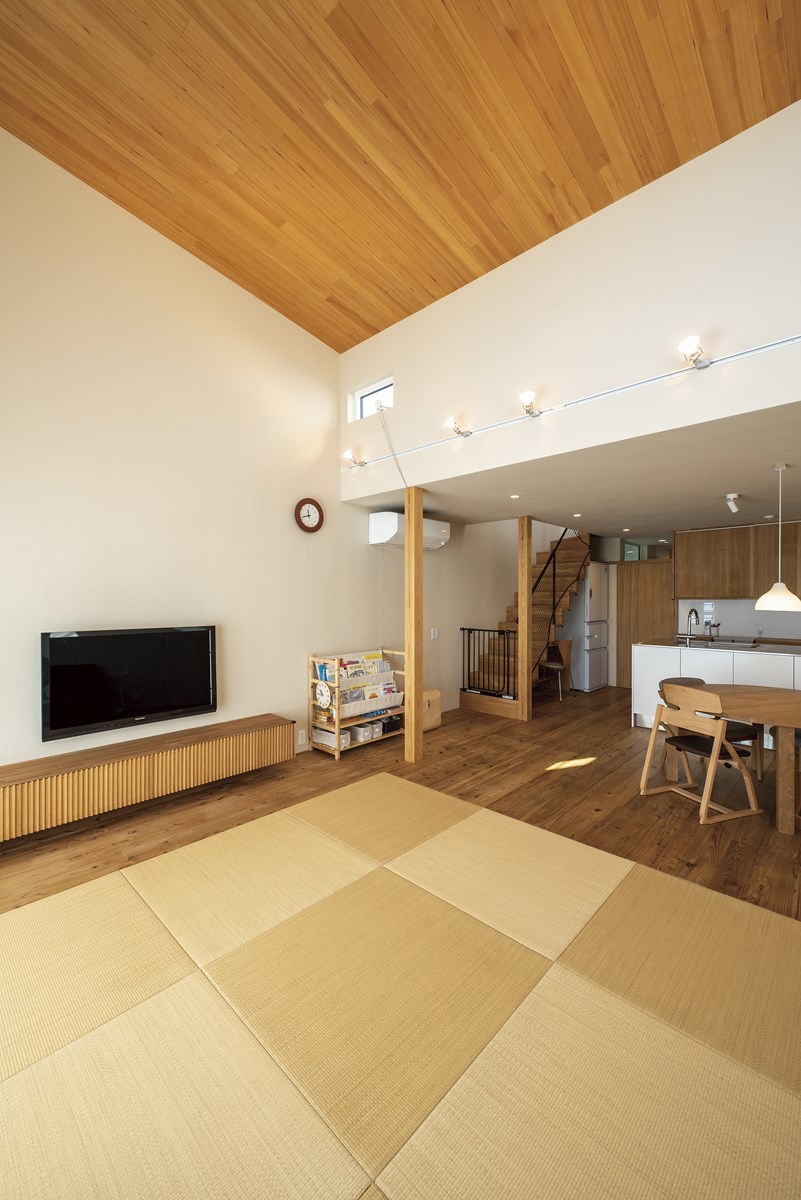 天井木貼り:ヘム(栂)、畳:天然イ草(床暖房対応)、テレビボード:造作