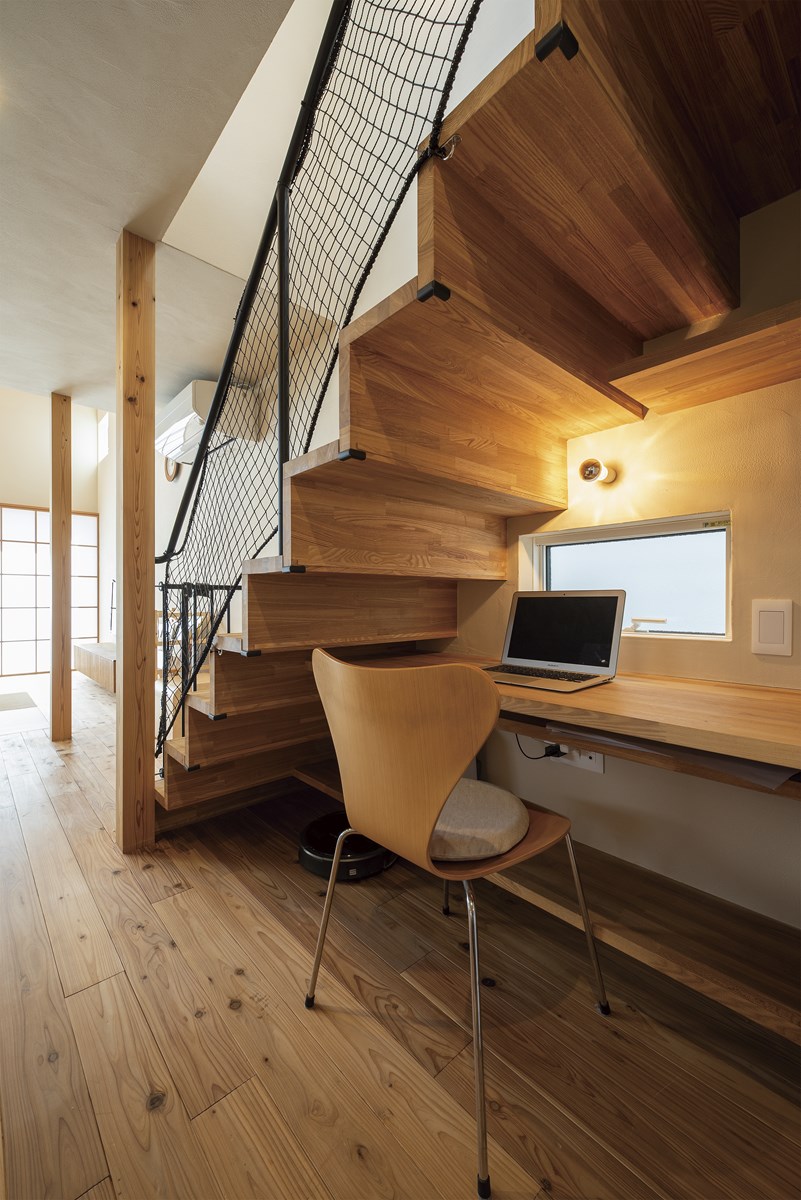 階段材:タモ集成材、手すり:造作鉄骨
