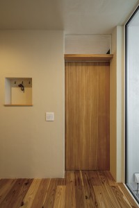 壁:珪藻土、フローリング:屋久杉、キッチン:サンワカンパニー、吊り戸収納:造作