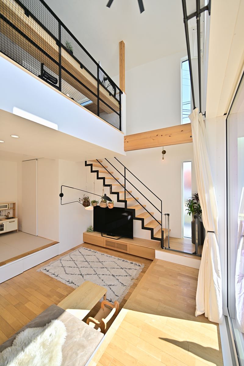 畳:DAIKEN 清流(灰桜色)、リビングブラケット照明:アプリク ミュラル ドゥ ブラ ピヴォタン、建具:リクシル ラフィス、階段:造作