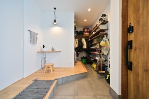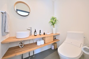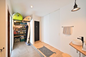 手洗い上部照明:上手工作所Bell、ボウル:サンワカンパニー シガラキロール、水栓:サンワカンパニー ニューベガトール、建具:リクシル ラシッサ・ラフィス、玄関タイル:サンワカンパニー リバーサイド