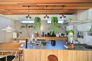 壁:漆喰、天井木貼り:レッドシダー、フローリング:オーク(床暖房対応)、キッチン:ウッドワン スイージー
