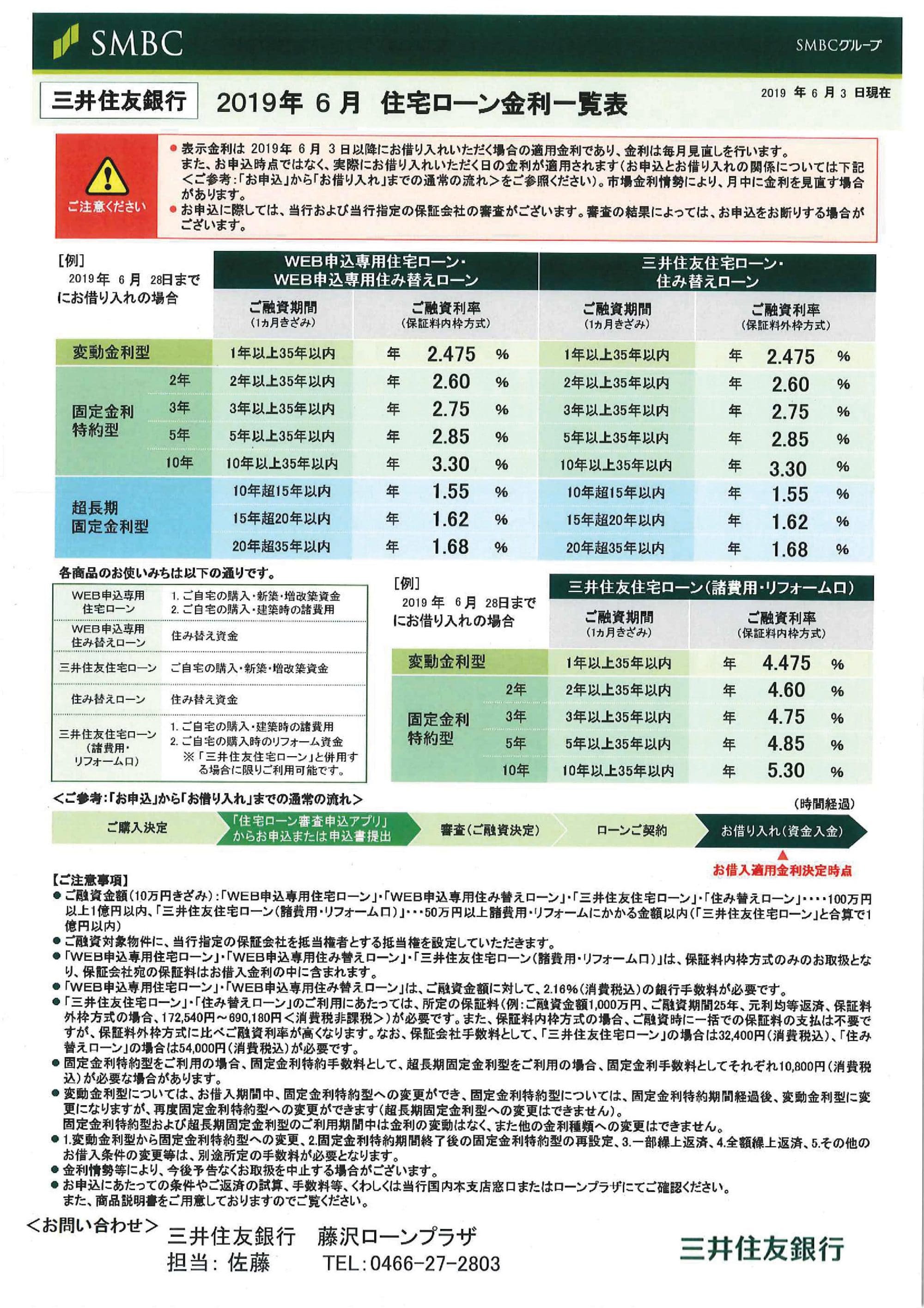 6月 三井住友銀行住宅ローン金利 こちらも長期下がりましたね↓