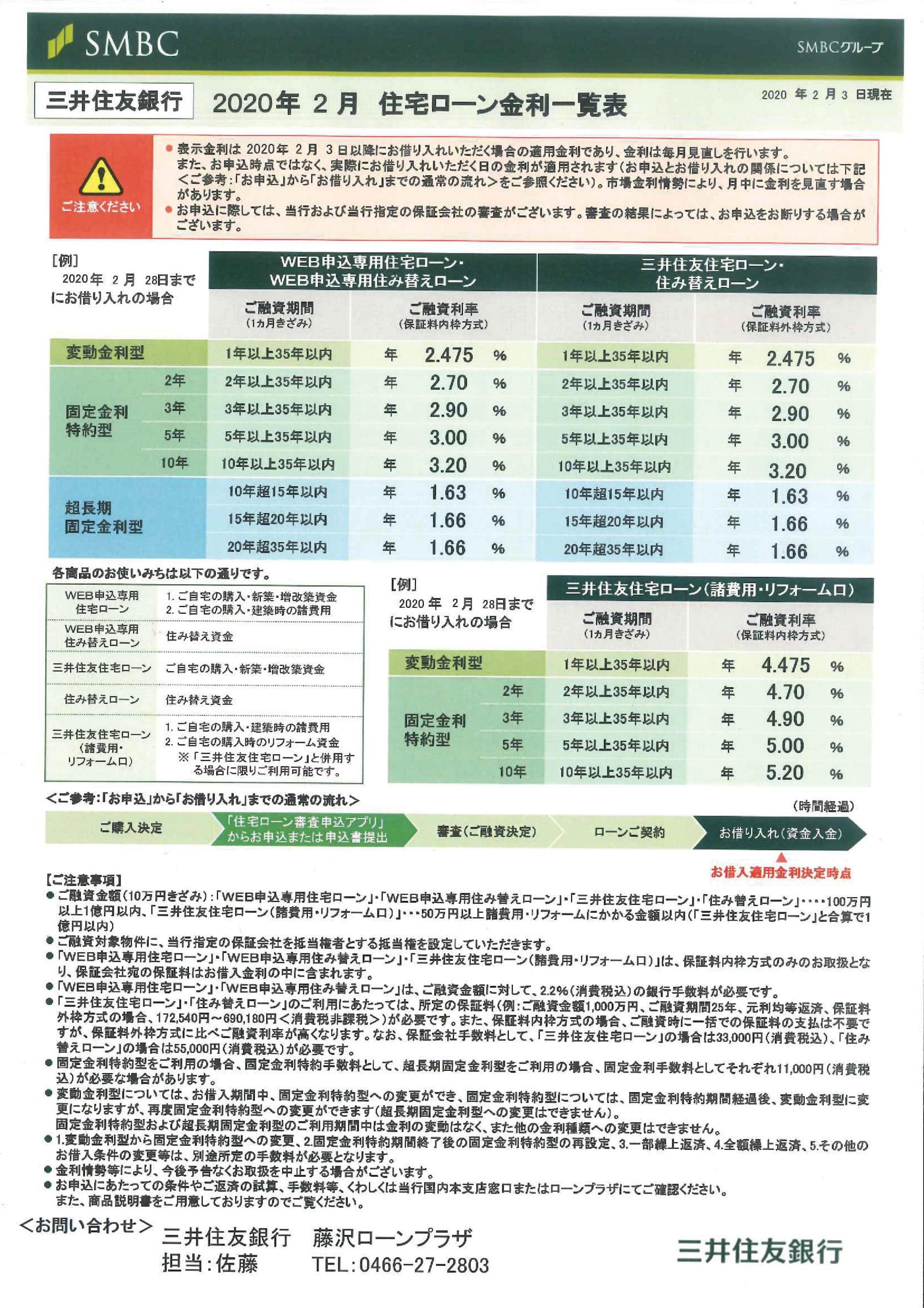 2020年3月 三井住友銀行住宅ローン金利 ほぼ変更ありませんでした⇒