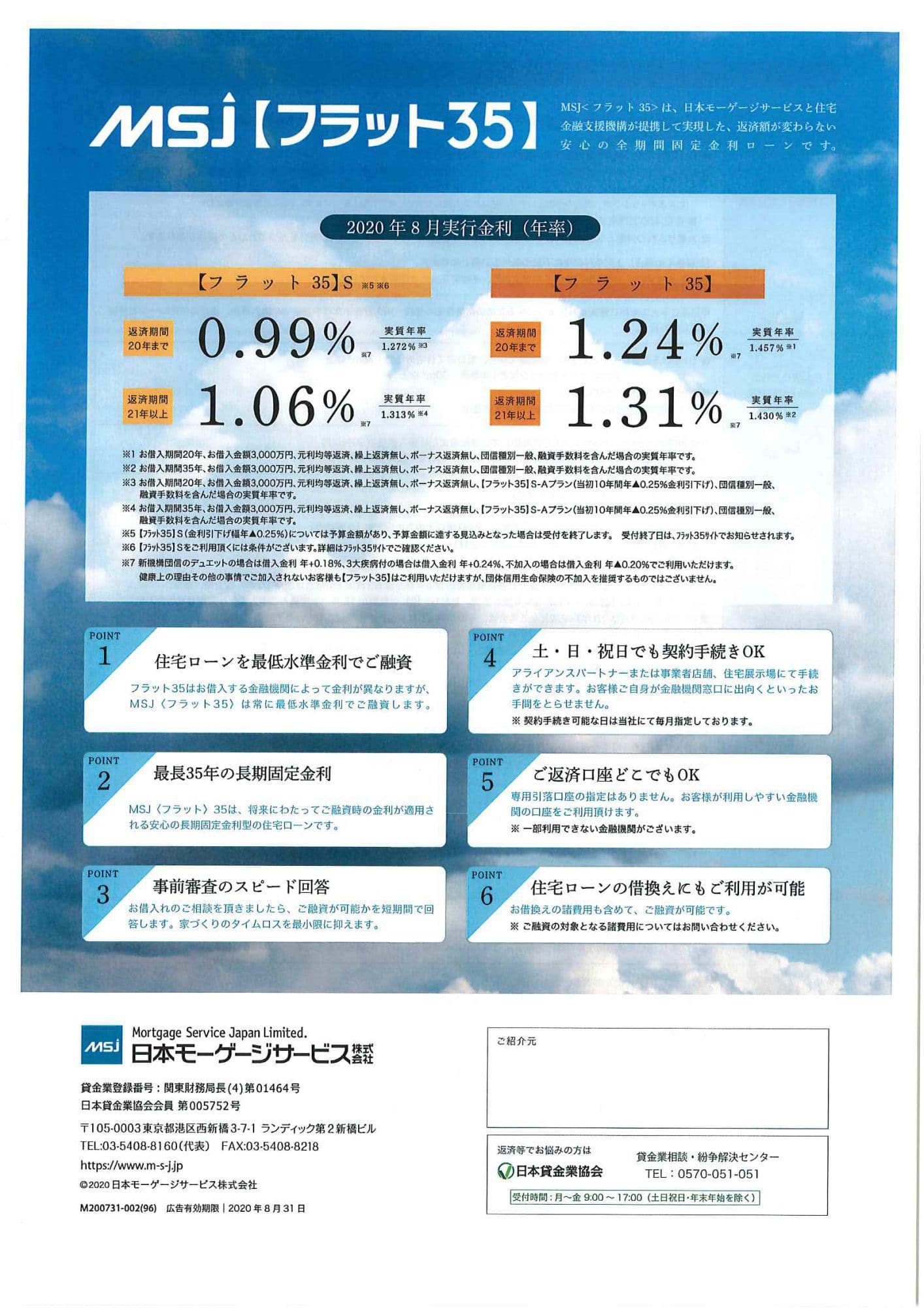 ecomoふどうさんの 2020年8月のMSJ フラット35 先月よりちょっと上がりました。↑ ecomoふどうさんの8月のフラット35金利情報のお知らせ先月(7月)よりフラット35 0.01%上がりました。 ※フラット35 ・ フラット35Sについて 不動産ブログにて詳しく解説しております。 そちらも是非 ご覧下さい。 ※更に詳しく知りになりたいお客様、またはご相談希望のお客様は、 ecomoふどうさん担当手塚まで お問合せください。 問い合わせ電話番号 0120-75-7355