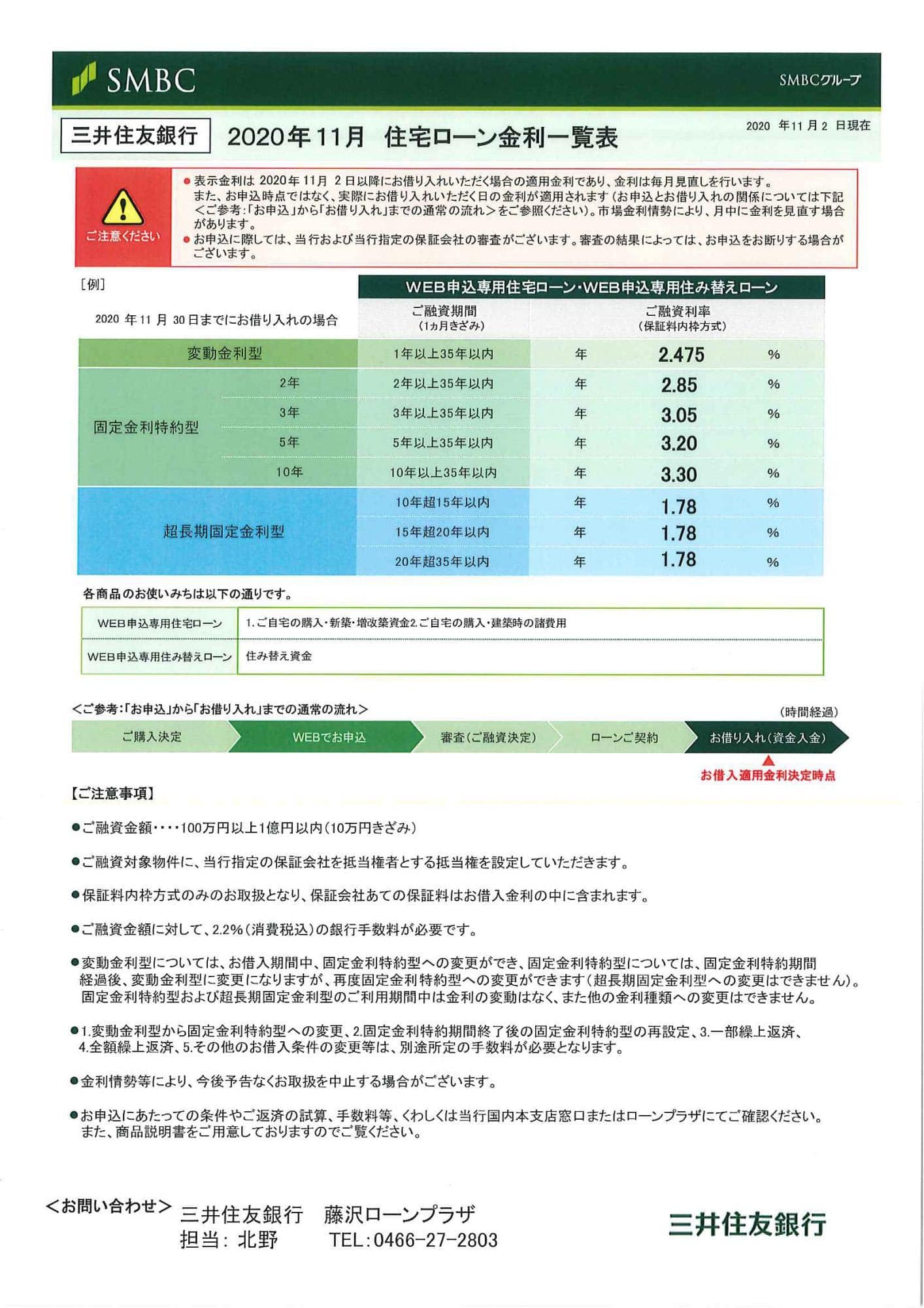 2020年11月 三井住友銀行住宅ローン金利 先月とほぼ変わりません。→