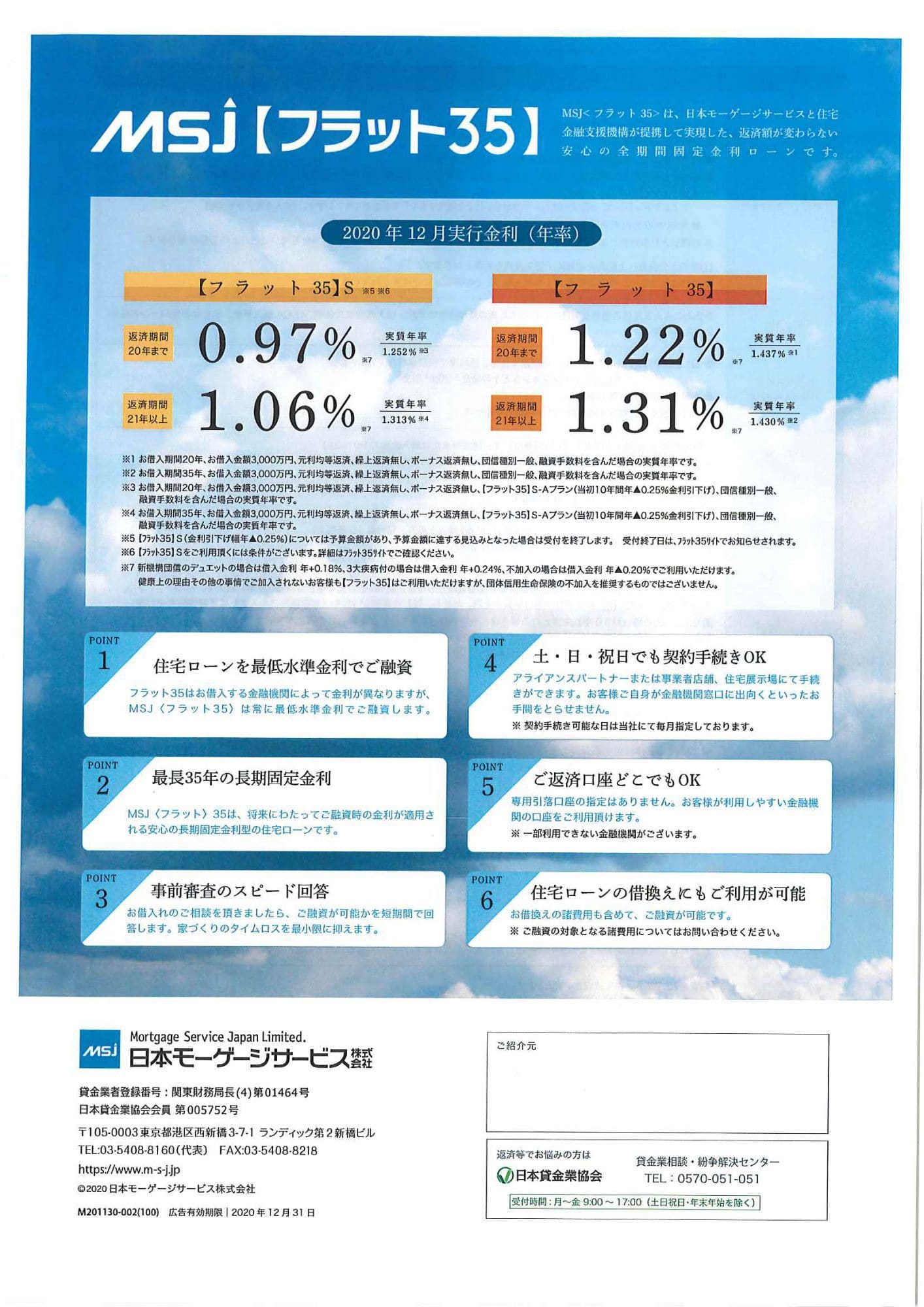ecomoふどうさんの 2020年12月のMSJ フラット35 先月変わりません。→ ecomoふどうさんの12月のフラット35金利情報のお知らせ先月(11月)と変わりません。 ※フラット35 ・ フラット35Sについて 不動産ブログにて詳しく解説しております。 そちらも是非 ご覧下さい。 ※更に詳しく知りになりたいお客様、またはご相談希望のお客様は、 ecomoふどうさん担当手塚まで お問合せください。 問い合わせ電話番号 0120-75-7355