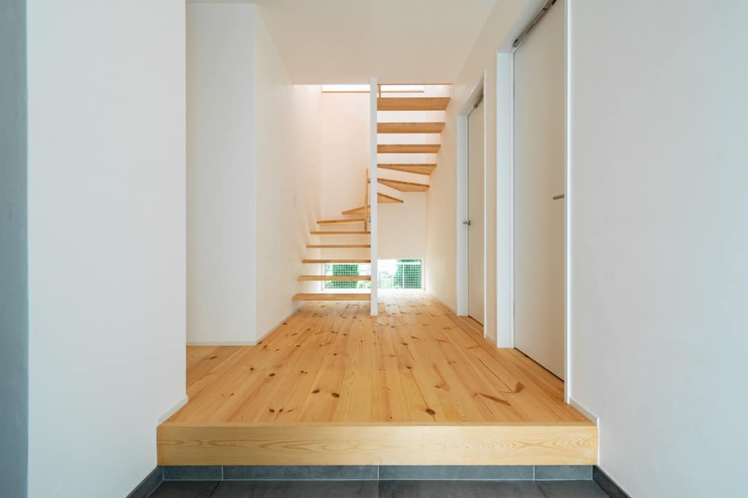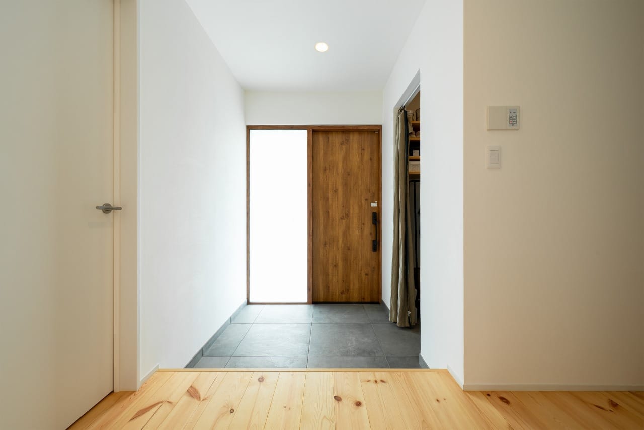 建具:パナソニック ベリティス(しっくいホワイト)、階段材:ゴム集成材、玄関タイル:名古屋モザイク コットメント
