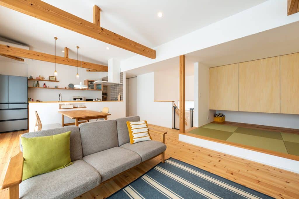 2階のリビングには小上がりの畳スペースを設けました。畳の上にある収納は造作で作りました。