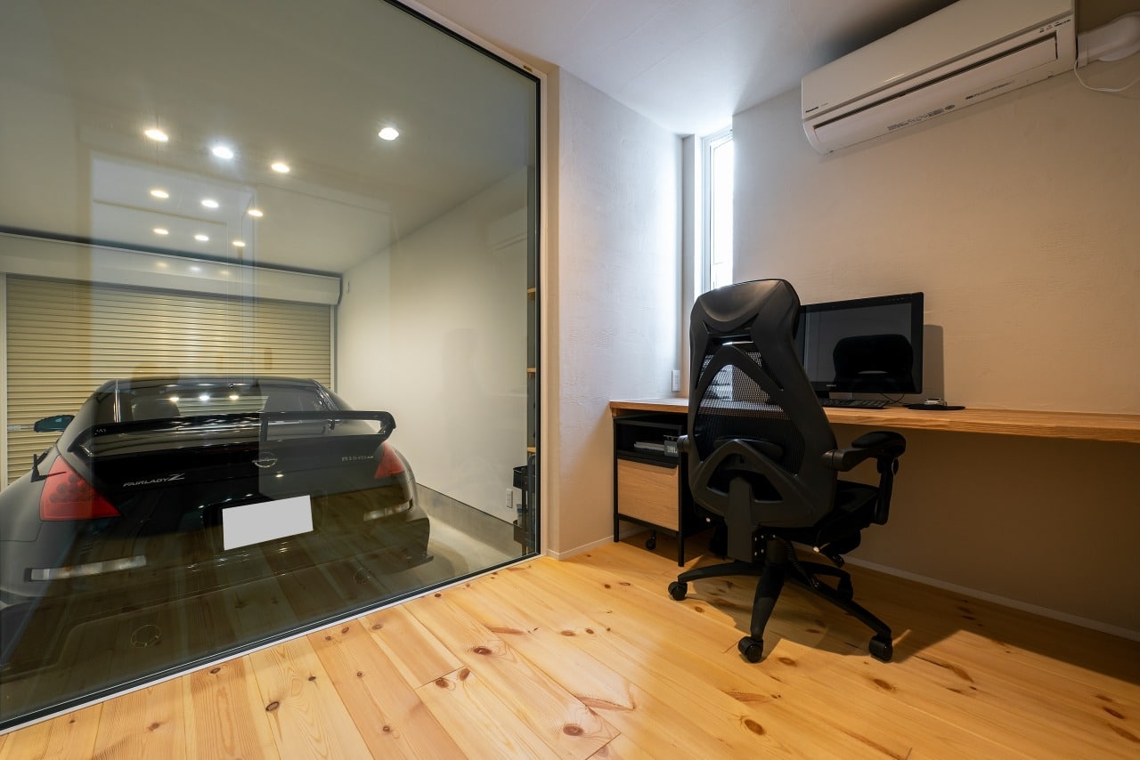 車好きのご主人は常に車が見える位置に仕事部屋を配置しました。照明の位置や色までこだわりました。