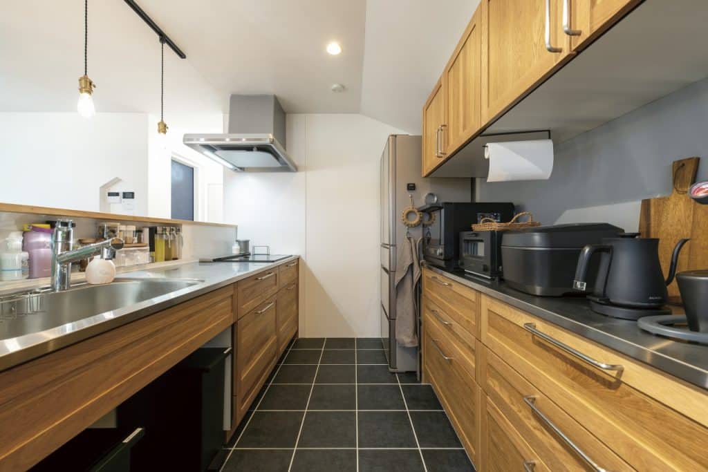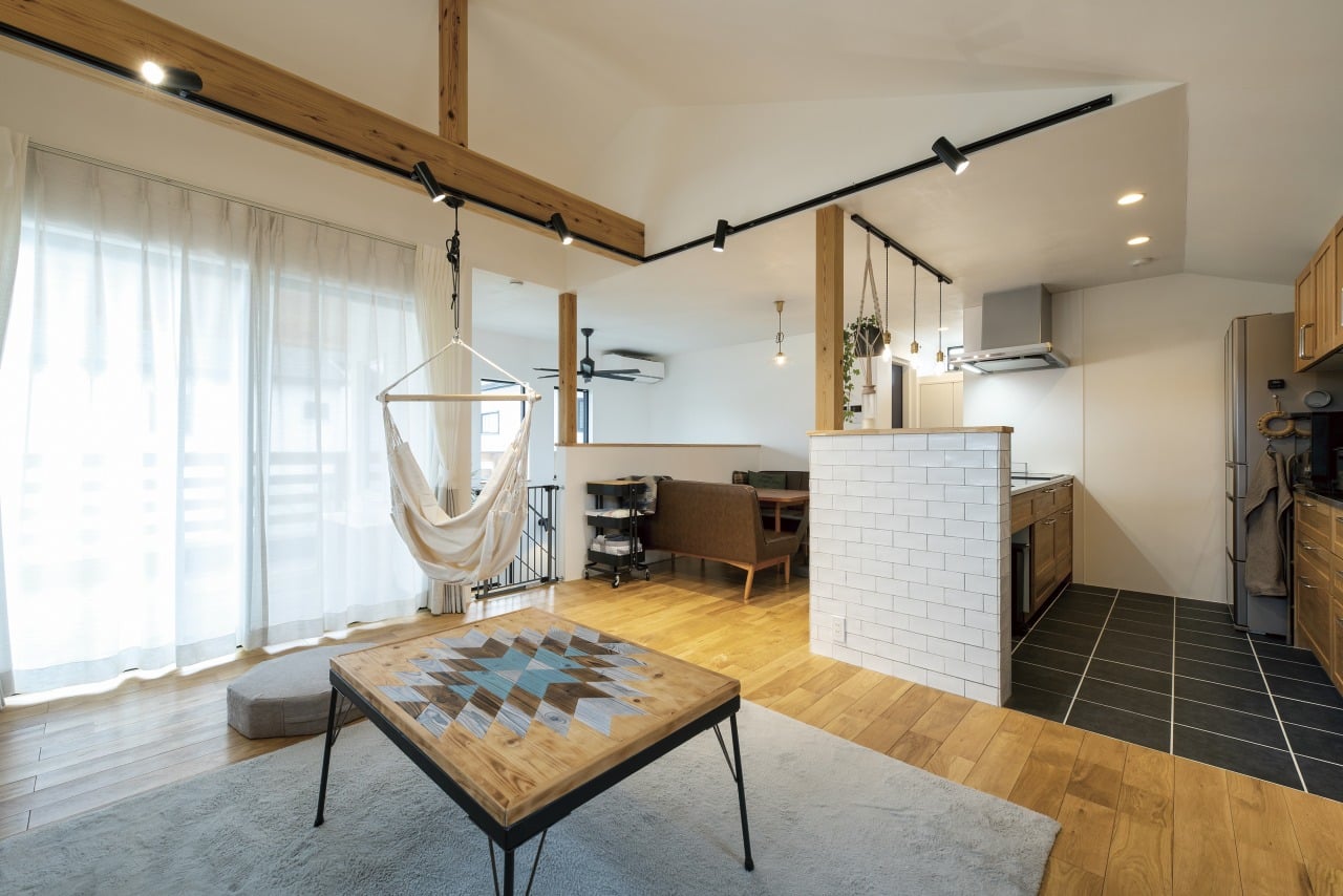床:オーク(12㎝)、壁:漆喰、キッチン:ウッドワン スイージー(オーク)、キッチン床タイル 名古屋モザイク シクラスⅡ、キッチン腰壁タイル:名古屋モザイク マシア