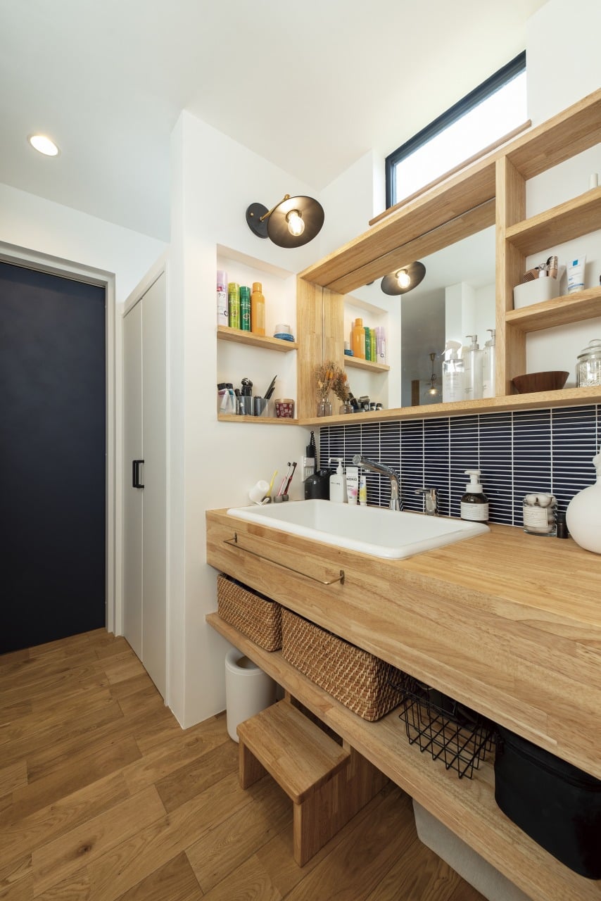カウンター:タモ集成材、ボウル:TOTO SK106、水栓:カクダイ、タイル:名古屋モザイク IPボーダーW、建具:リクシル ラシッサ(ヴィンティア)