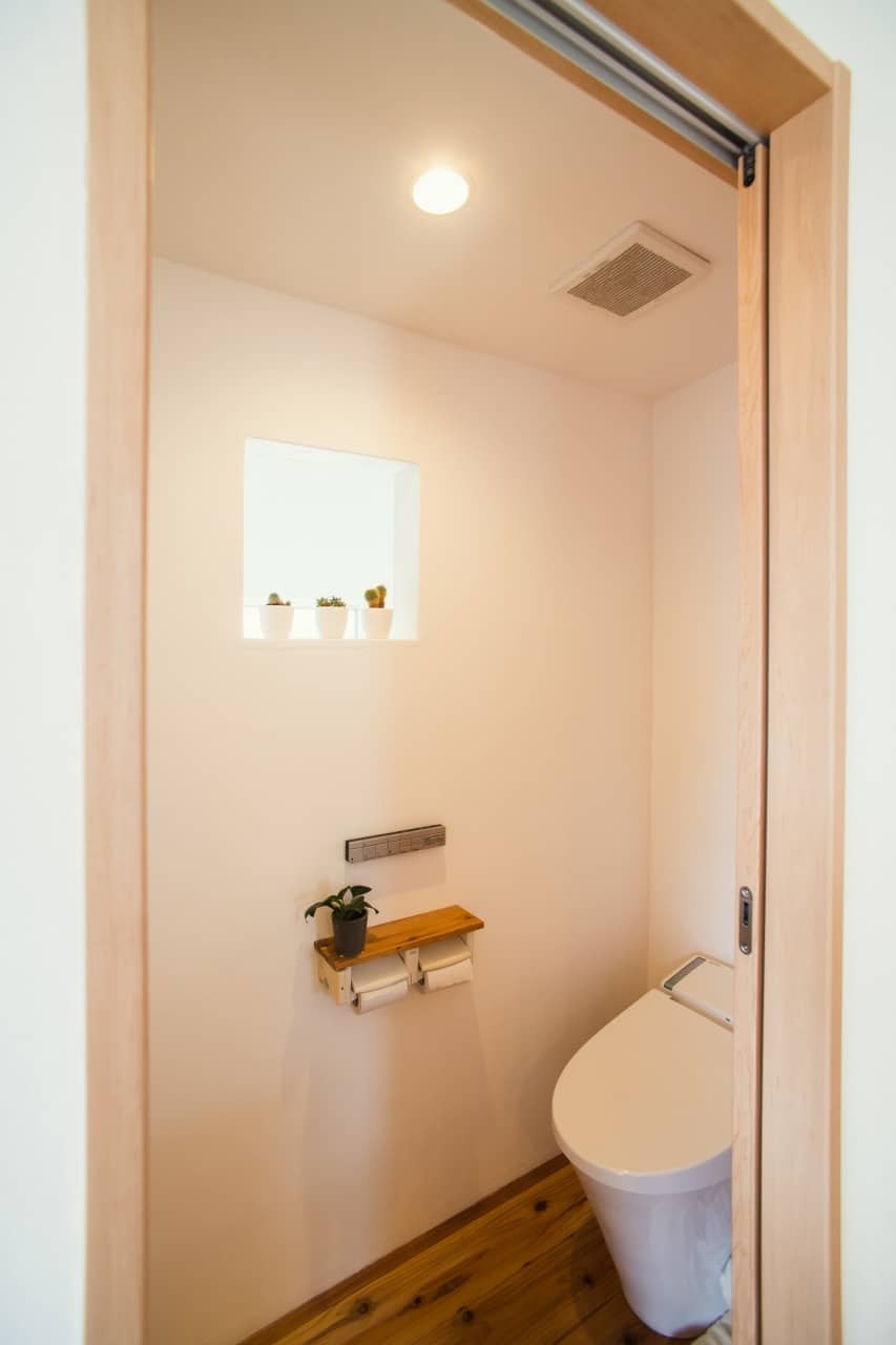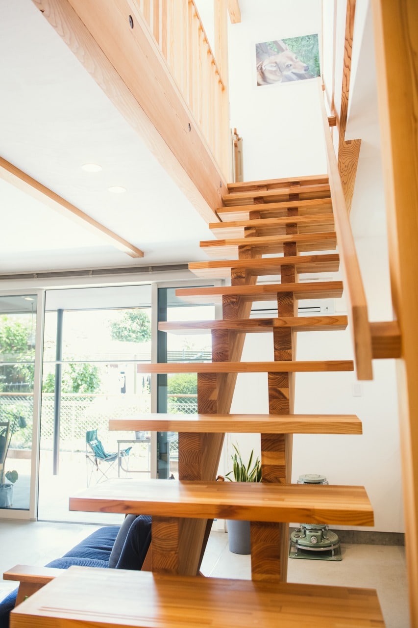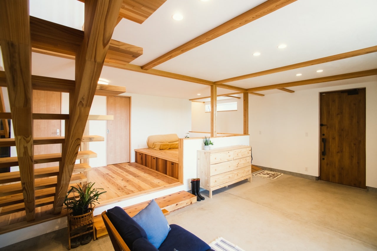室内壁:スイス漆喰、フローリング:杉、建具:ウッドワン ソフトアート、階段:杉集成材