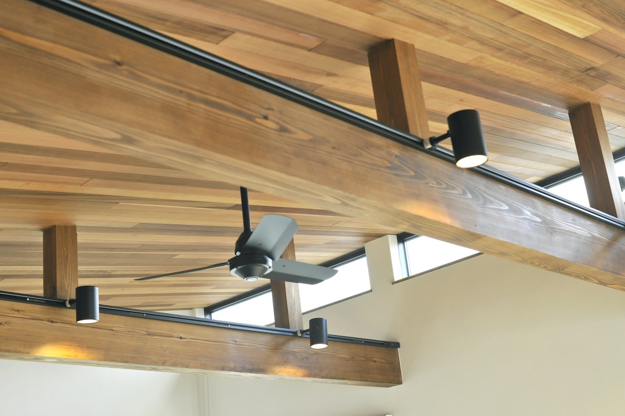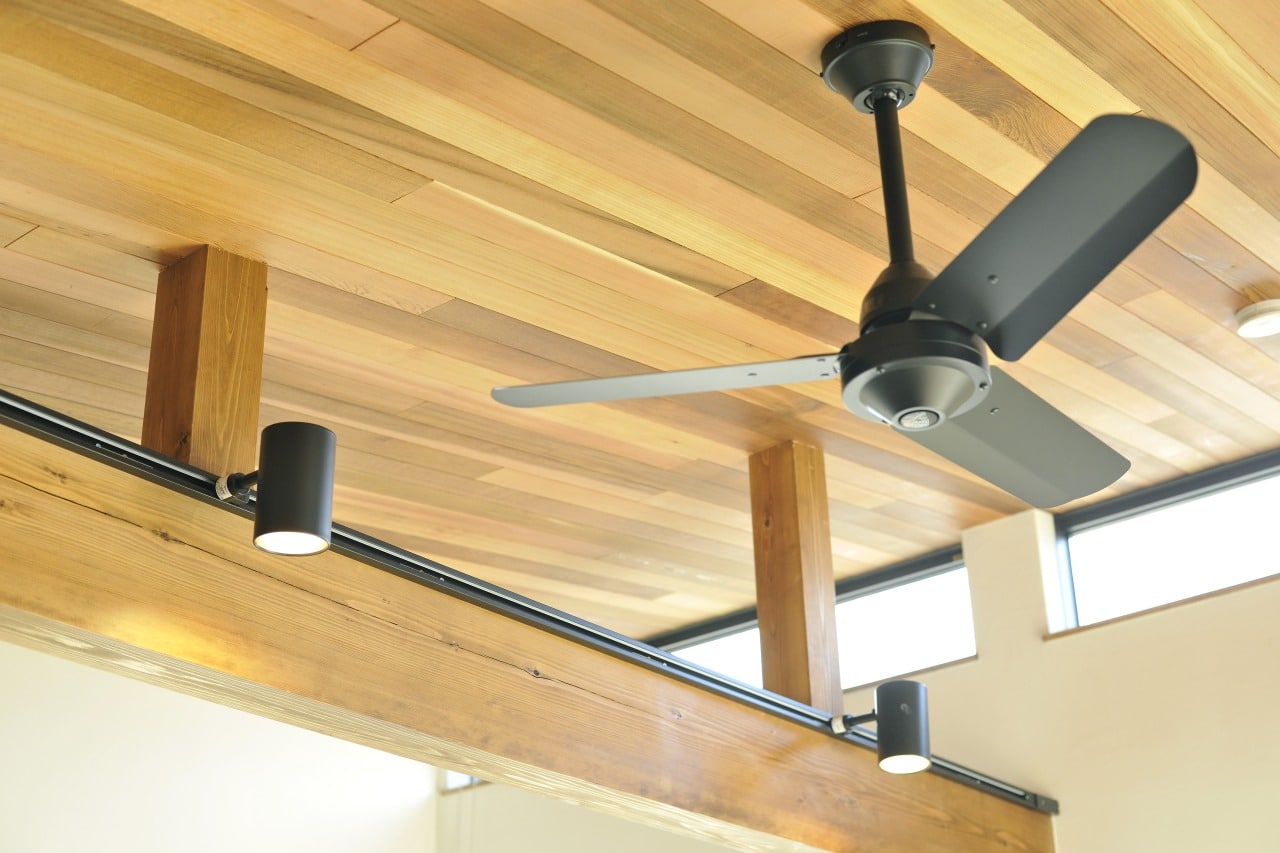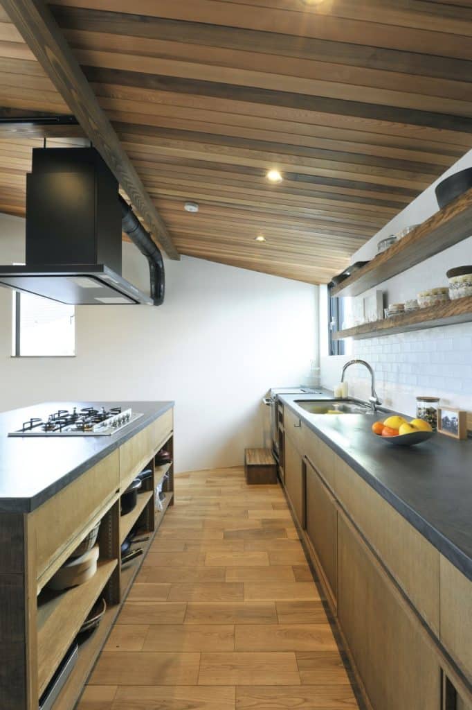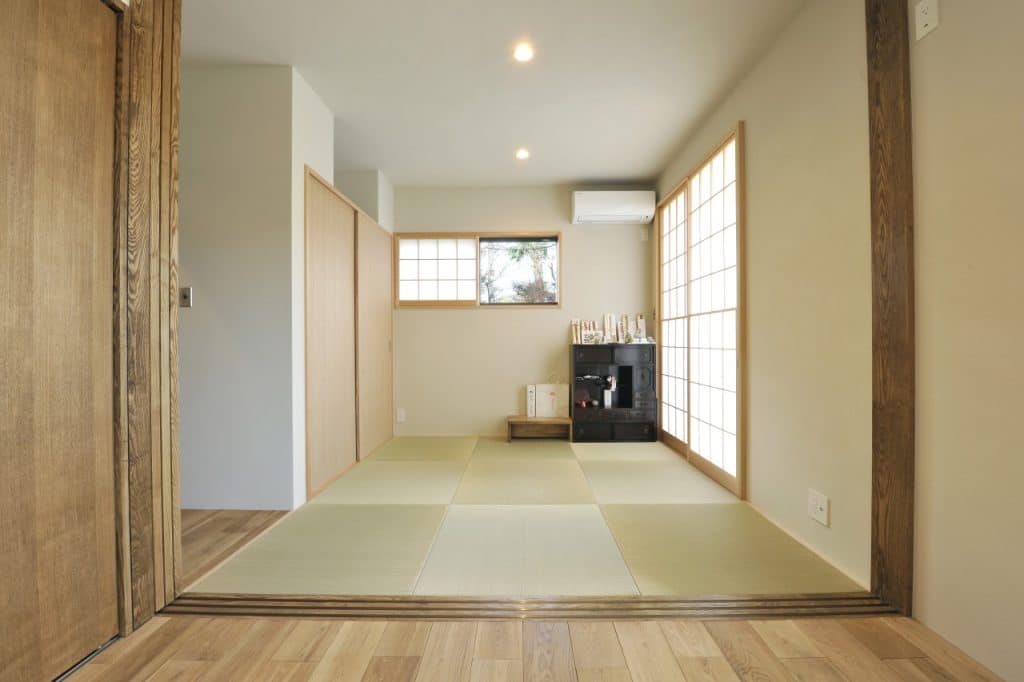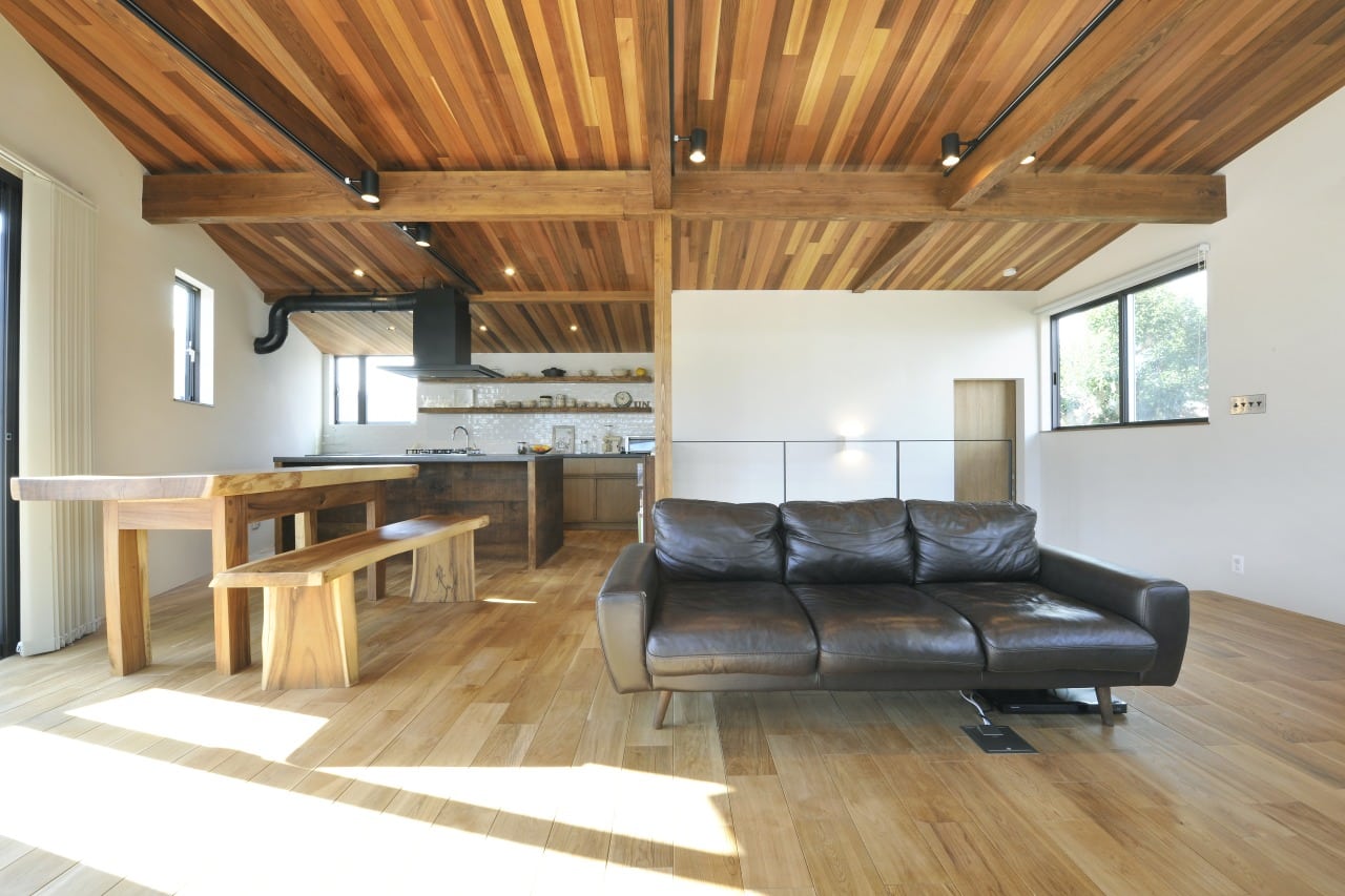 床:オーク、壁:珪藻土、天井:レッドシダー、サッシ:リクシル サーモスX