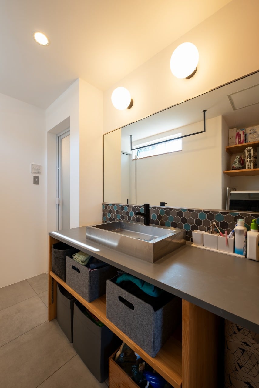 ボウル:サンワカンパニー カリッサ、水栓:サンワカンパニー ニューベガ、鏡:造作(ステンレスフレーム)、タイル:平田タイル シャンパーニュ